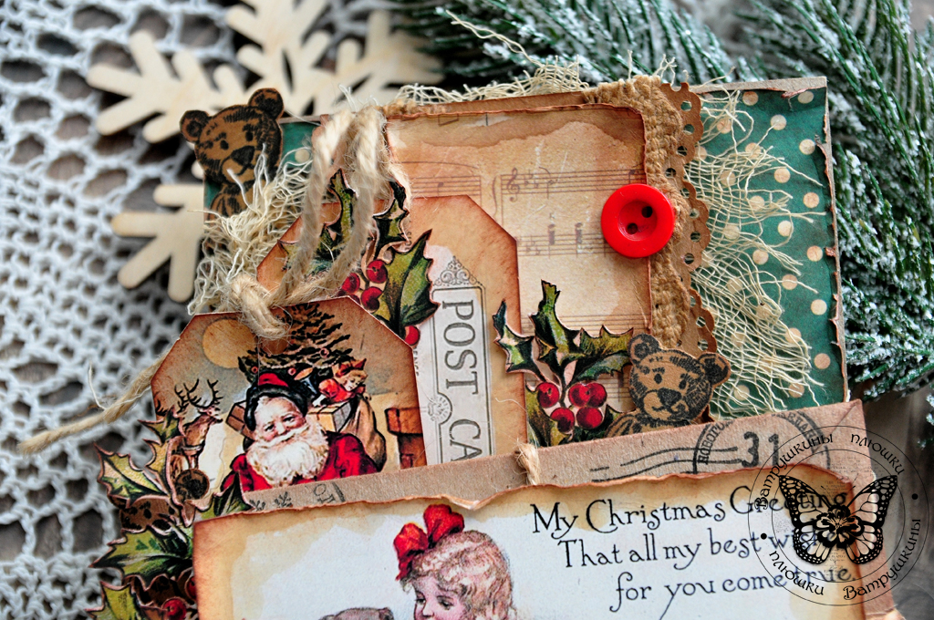 Для открытки использовала: крафт бумага в качестве основы, остатки зеленой бумаги в горох и с нотами неизвестных уже мне производителей, марля крашенная в чае, вязаное кружево крашенное в кофе, картинка (с девочкой, остролист, мишки) и тэги из интернета распечатаны на принтере на плотной фотобумаге и крафт бумаге, из крафт бумаги сделала конверт, нанесла на него новогодние почтовые штампы и перевязала бечевкой, а еще чуть не забыла про подложку из крафт бумаги с дырокольным краем под обрезком бумаги с нотами, пуговички (нашла старые и уже давно ни кому не нужные) и самодельный цветок пуансетии из красной акварельной бумаги, сверху немного покрыт акриловой краской (белой и под медь) и золотыми блестками, шебби лента, кружево и старенькая, давно уже не используемая металлическая брошка. Чтобы придать открытке винтажности рвала и шкурила края бумаги, вымачивала в кофе, красила края коричневой штемпельной подушечкой.